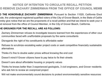 These are the reasons that the members of Grover H2O site for the recall of Councilmember Zach Zimmerman. This statement appears on the Intent to Circulate a Recall Petition, on the actual Recall Petition, and on as the Recall Ballot Statement.