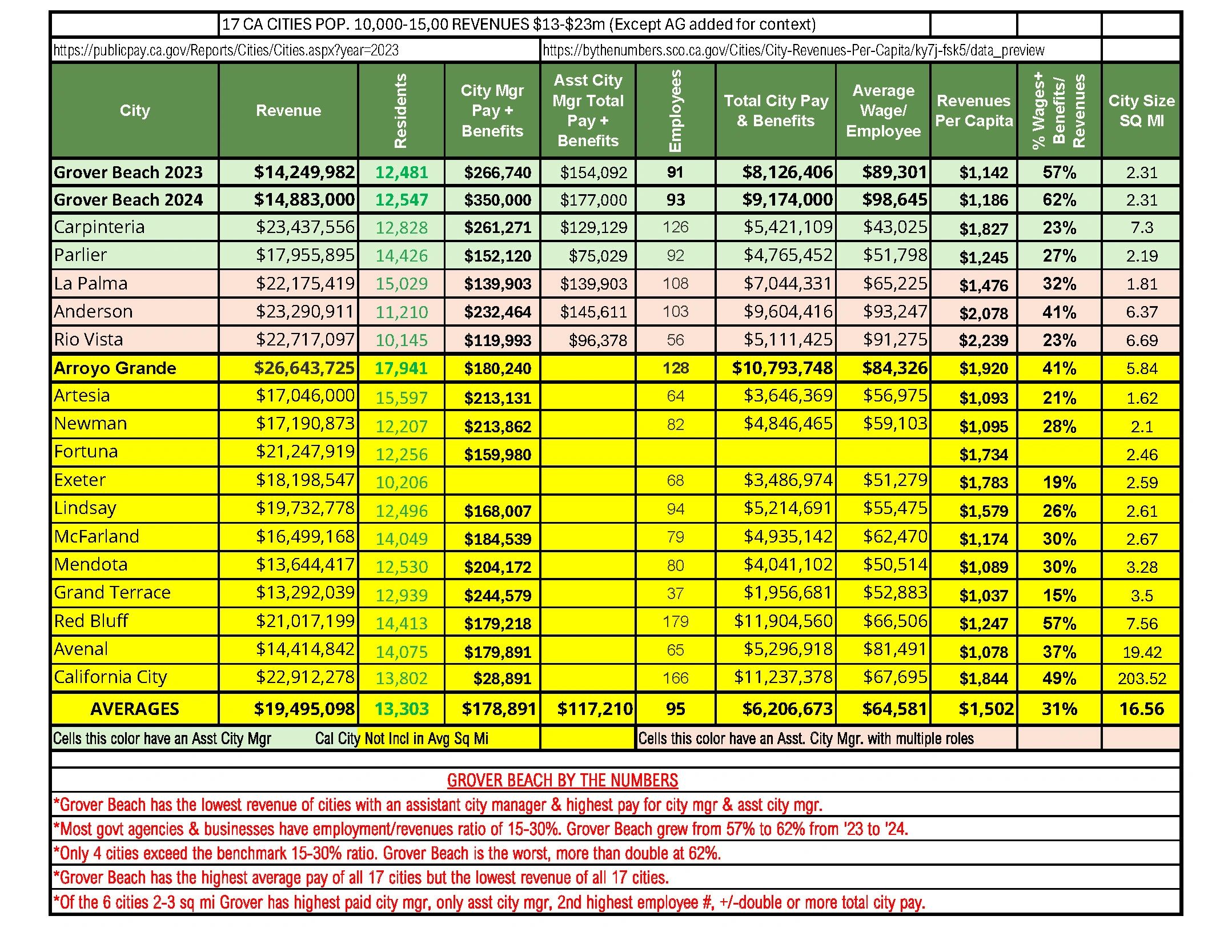 The Grover Beach (population <14,000) makes almost $400,000 a year. More than any other California city of similar population & budget & more than the Governor of California (population 40,000,000). Grover Beach is the only city of its size to also have an assistant city manager.