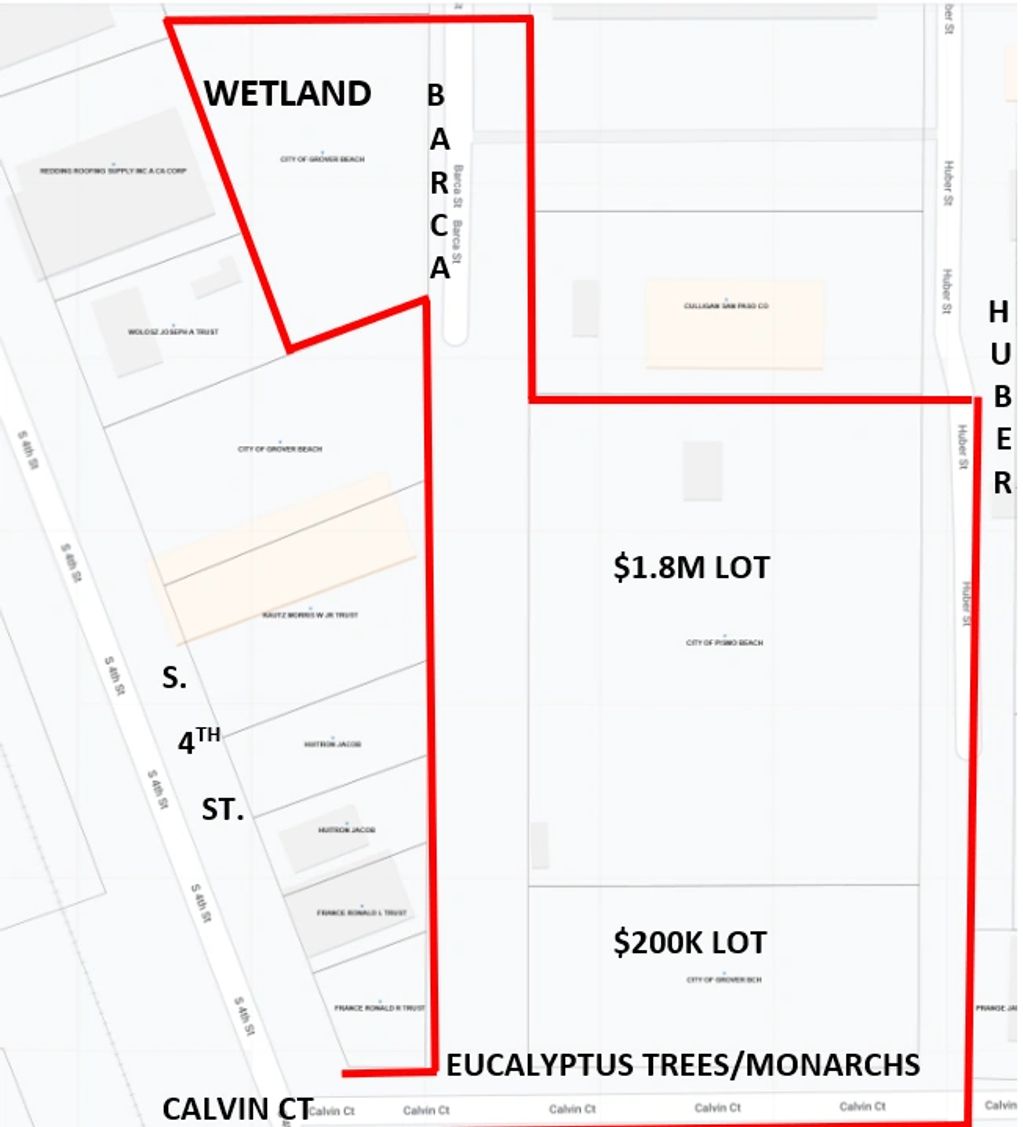 The area inside the red lines is the property owned by Grover & Pismo now a part of Central Coast Blue.