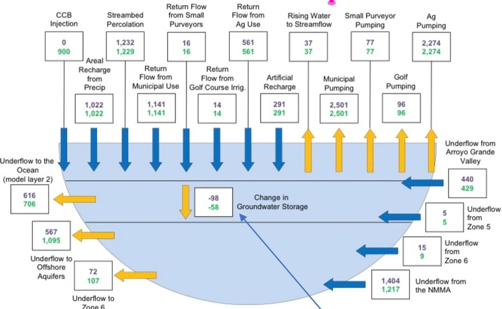 This graphic from Central Coast Blue shows the water in and the water out IF we were currently drawing 2,500 acre-feet a year from our aquifer and if we draw 2,500 acre-feet per year with the CCB project. However, we draw only 1,000 acre feet a year and that is sufficient to supply the City of Grover Beach.