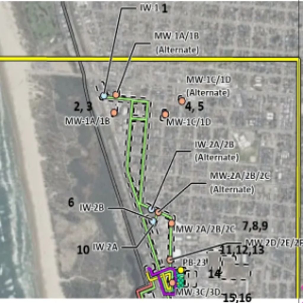 Screenshot from the Environmental Impact Report Addendum: plan to drill 16 wells in Grover neighborhoods. Follow the black numerals for the count & locations. Mayor Bright says in her response to the recall that it is only 5 wells. More recent verbal reports from Central Coast Blue say it will be only 3 injection wells, 5 monitoring wells, and a new well for Pismo Beach. Most of the wells cluster